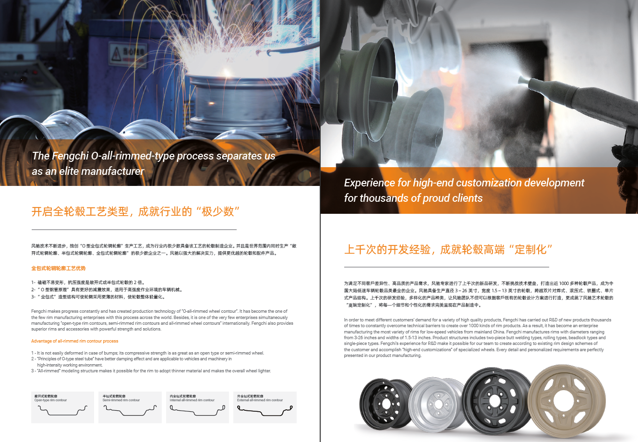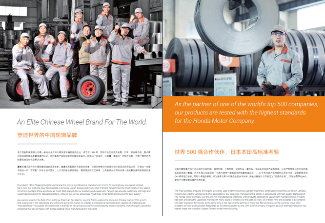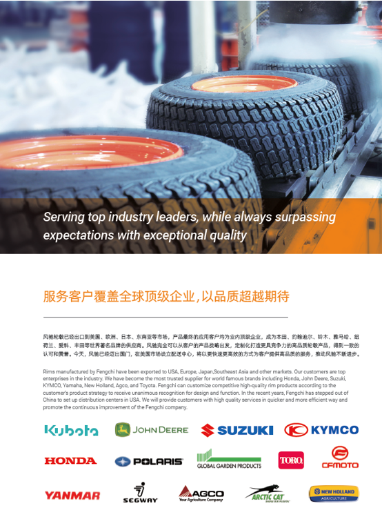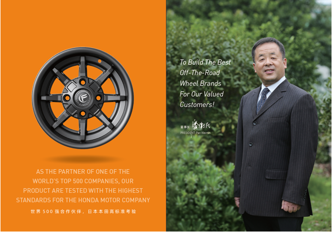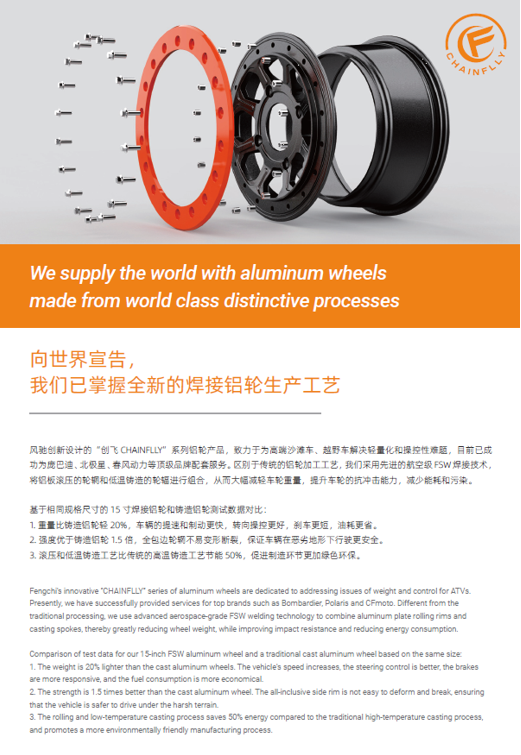 浙江風馳機械有限公司,成立于1994年,伴隨著時間的飛逝,一直以工匠精神專注生產(chǎn)非公路低速車輛輪轂,在董事長潘衛(wèi)民的英明帶領(lǐng)下,風馳以自信、沉穩(wěn)、堅實的腳步,企業(yè)逐步成為了世界500強合作伙伴、申請了企業(yè)獨有的輪輞品牌、創(chuàng)立了旗下5家子公司、獨創(chuàng)特殊工藝、產(chǎn)品革新?lián)Q代,一直以實現(xiàn)“引領(lǐng)低速車輪發(fā)展,為中國制造正名”的使命及成為“全球知名低速車輛制造企業(yè)的最佳戰(zhàn)略合作伙伴”為愿景而一直努力著。